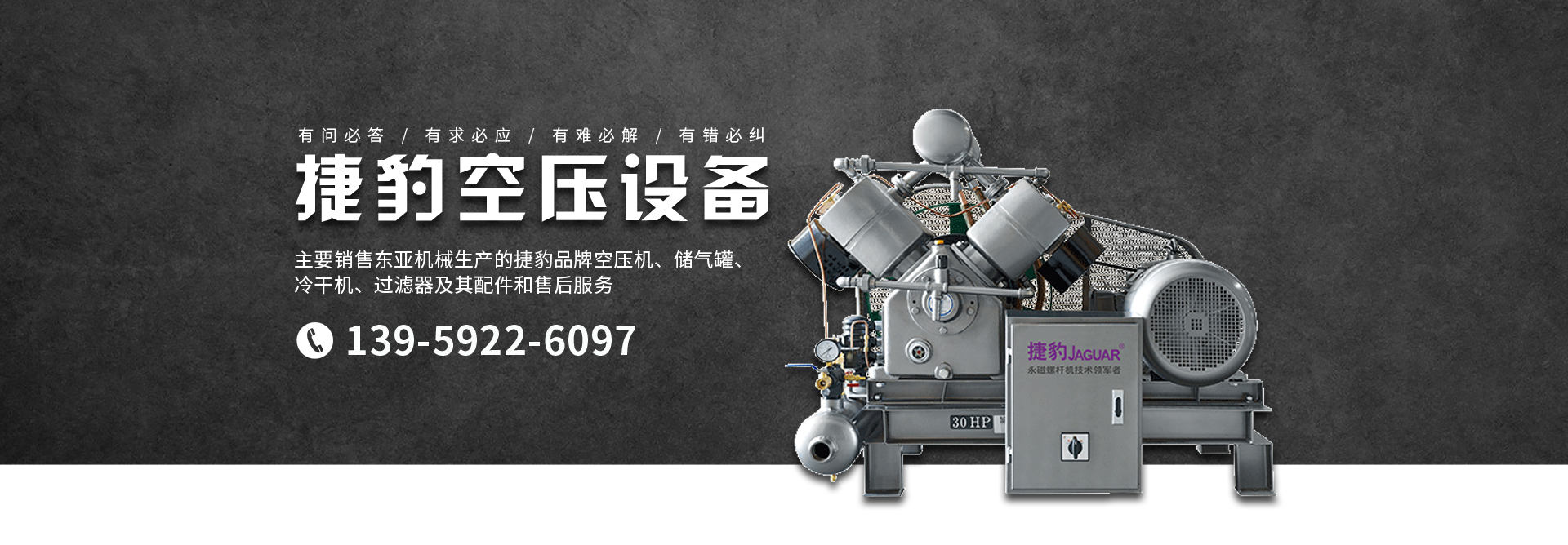 主要銷售東亞機(jī)械生產(chǎn)的捷豹品牌空壓機(jī)、儲(chǔ)氣罐、冷干機(jī)、過濾器及其配件和售后服務(wù)。